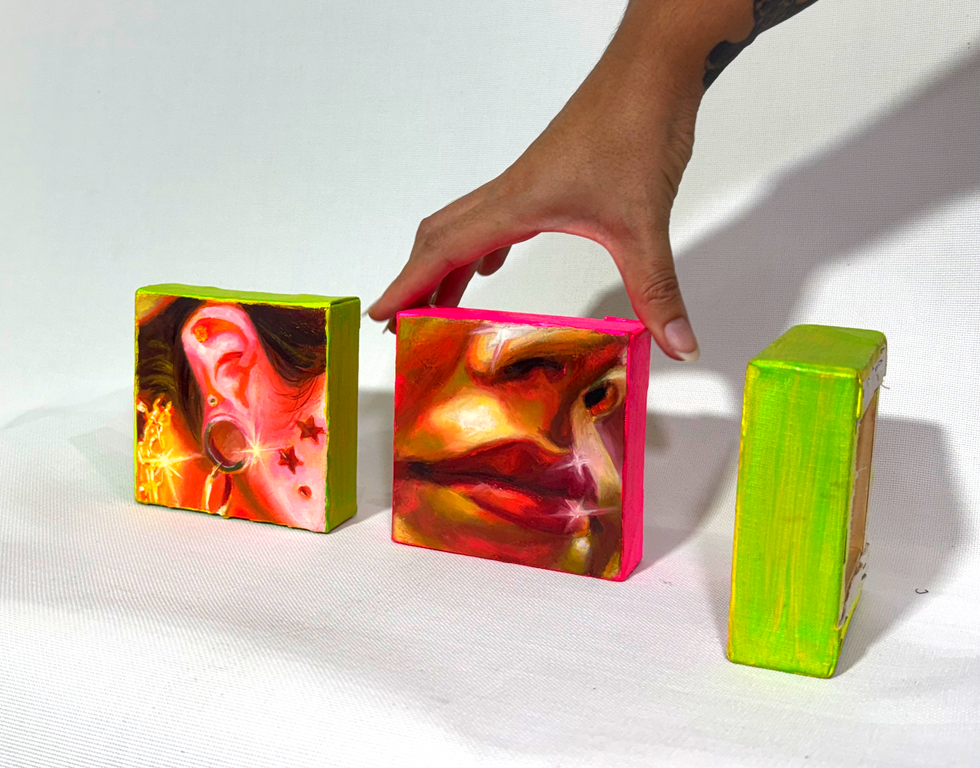 Na serie, escolhi representar fragmentos de retratos – um "objeto" que, à primeira vista, pode até parecer difícil de se perder, uma vez que se trata do rosto de alguem. Mas que é até comum a ideia de poder se sentir meio distante de partes da nossa própria identidade, mesmo que essa sensação venha envolta em cores vibrantes.